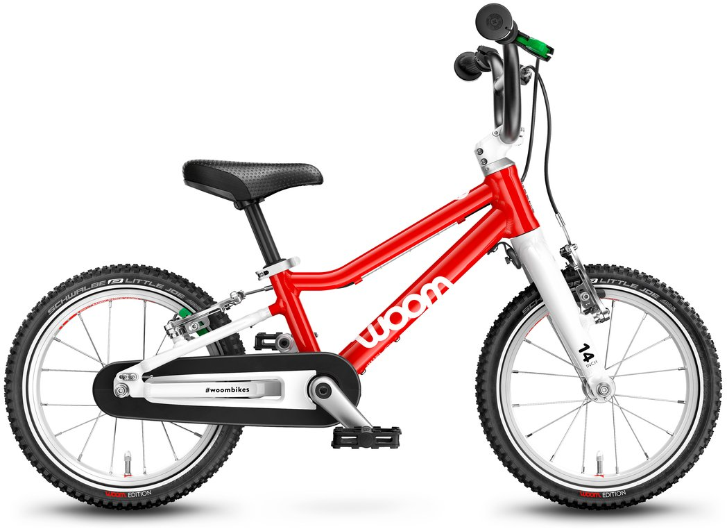 | Tires | Schwalbe Little Joe 14” x 1.4" – woom edition Lightweight tires provide ample shock absorption, low rolling resistance and maximum grip Schrader (car-type) valves Reflective striping on tire sidewall for optimal visibility even in low-light conditions |